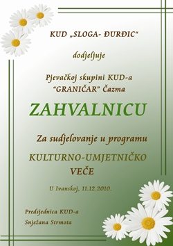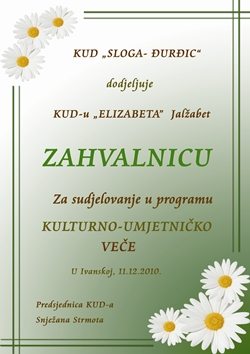 11.12.2010.god.održano je kulturno-umjetničko veče po četvrti put u Sportskoj dvorani u Ivanskoj domaćini KUD “Sloga-Đurđic” ugostili su i ove godine više kulturno-umjetničkih društava,tako dragi gosti bili su nam: