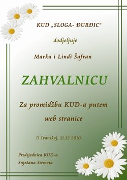02.01.2010. god. Društvo na poziv Turističke zajednice grada Čazme gostuje u Čazmi ,u sklopu obilježavanja Božićnog sajma u Čazmi i Božićne priče u Grabovnici,društvo se predstavilo sa pjesmama i plesovima našeg Moslavačkog kraja,te recitalom gosp. Mirka Krušića i izvedbom Bunjevačkog velikog kola.